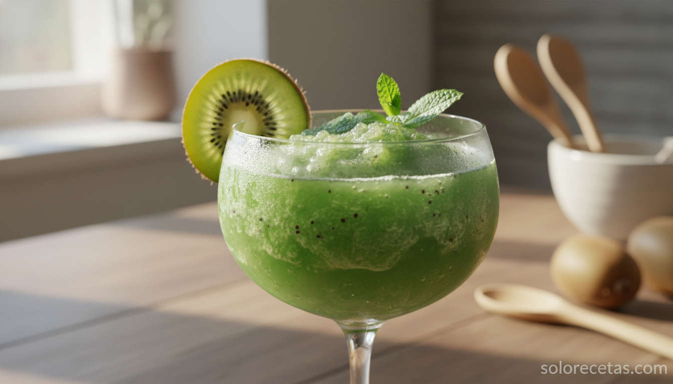 La base (puré de kiwi con lima y almíbar) sí puedes prepararla hasta dos horas antes y guardarla en la nevera bien tapada. La mezcla con el alcohol y el batido con hielo deben hacerse en el momento de servir, porque el granizado pierde textura en menos de 10 minutos.
