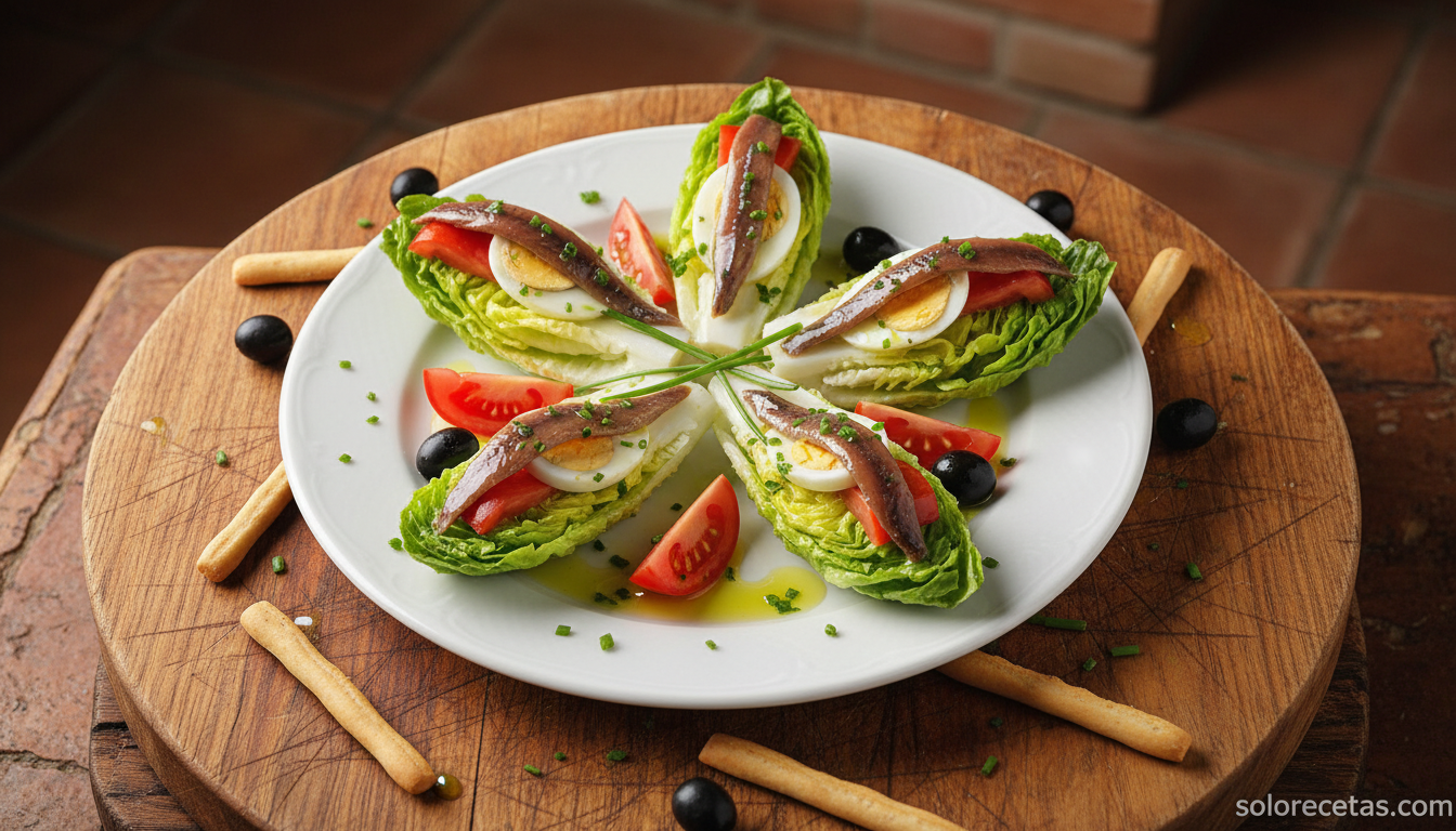 Para cuatro personas necesitarás 2 cogollos de lechuga bien frescos y compactos, 1 lata de anchoas en aceite de oliva (unas 8 filetes), 2 huevos cocidos, 1 tomate maduro grande o 2 medianos, aceite de oliva virgen extra, 1 cucharada de vinagre de vino, sal, pimienta negra recién molida y, opcionalmente, unos taquitos de queso curado para darle un toque extra.