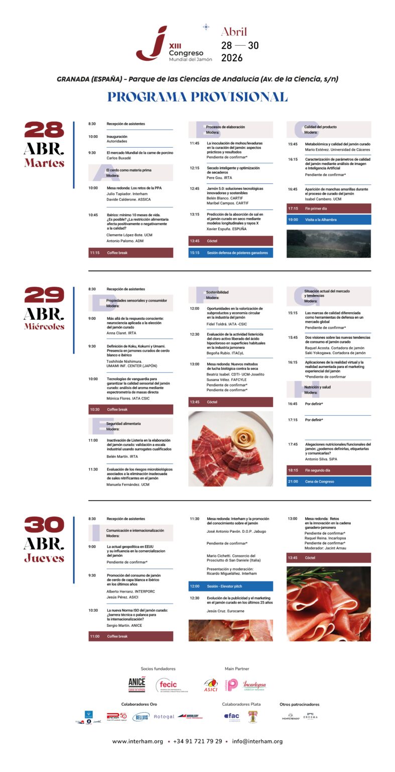 El XIII Congreso Mundial del Jamón no solo tiene como objetivo enriquecer el diálogo sobre el presente y futuro del sector, sino también reafirmar el papel de Granada como sede mundial de encuentros estratégicos y científicos. Las inscripciones ya están abiertas y ofrecen un 15% de descuento por pronto pago hasta el 2 de febrero.