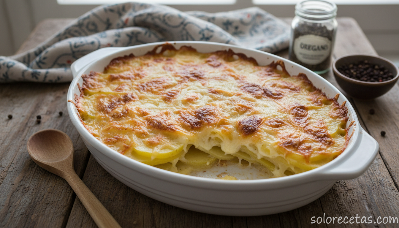 Abres el horno y te llega esa vaharada tibia a queso fundido mezclada con el aroma dulzón de la patata asada. La superficie burbujea dorada, las rodajas se adivinan tiernas debajo y, en los bordes, unas esquinitas tostadas anuncian el primer bocado crujiente. Las patatas con queso al horno son una de esas recetas humildes que resuelven una cena, acompañan una carne o se convierten en entrante compartido sin pretender nada y ganando siempre la partida.
